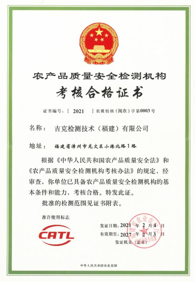 吉克檢測(cè)技術(shù)(福建)有限公司,位于福建省漳州市龍文區(qū)小港北路1號(hào),于2019年8月注冊(cè)成立,是一家獨(dú)立的第三方檢測(cè)公司。公司已經(jīng)通過檢驗(yàn)檢測(cè)機(jī)構(gòu)計(jì)量認(rèn)證(CMA)、農(nóng)產(chǎn)品質(zhì)量安全檢測(cè)機(jī)構(gòu)資質(zhì)認(rèn)證(CATL),獲得中國合格評(píng)定國家認(rèn)可委員會(huì)(CNAS)認(rèn)可。公司本著“嚴(yán)謹(jǐn)、規(guī)范、高效、協(xié)作”的原則和對(duì)客戶及社會(huì)高度負(fù)責(zé)的精神,充分利用本公司優(yōu)質(zhì)的檢測(cè)環(huán)境、先進(jìn)的檢測(cè)設(shè)備和專業(yè)的技術(shù)人員,第一時(shí)間為客戶提供科學(xué)、公正、準(zhǔn)確的檢驗(yàn)檢測(cè)報(bào)告。       公司實(shí)驗(yàn)室面積1100多平方米,儀器設(shè)備兩百多臺(tái)(套),固定資產(chǎn)一千多萬元,在職員工31人,技術(shù)人員中的中高級(jí)職稱及同等能力人數(shù)占60%以上。我們的服...